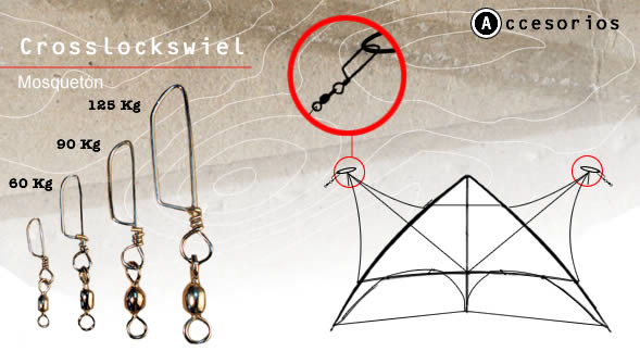 Mosquetón de diferentes resistencias para colocar en cualquier tipo de cometa, tanto acrobática como de un hilo.